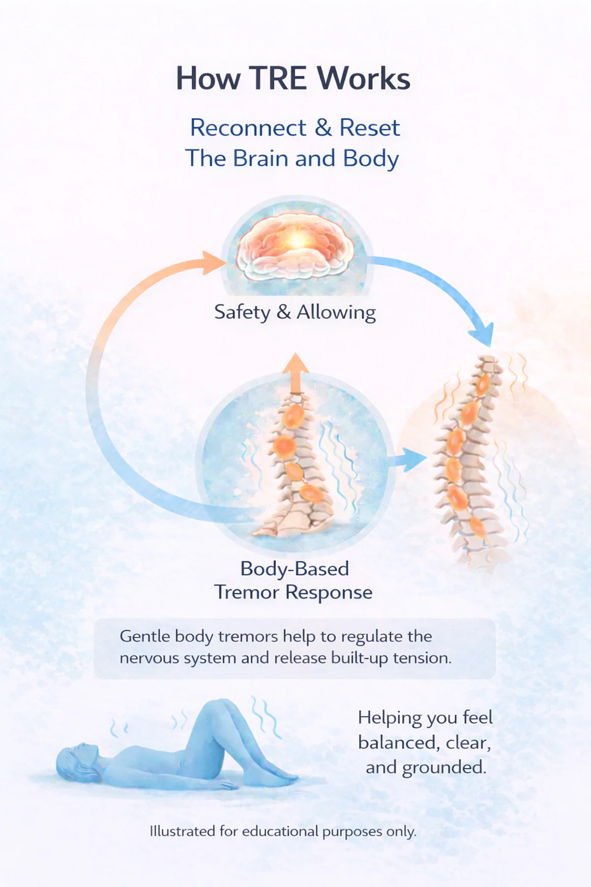 TRE may be practiced on its own or alongside psychotherapy. For individuals with a history of severe trauma or a mental health diagnosis, integrating this practice with the support of a licensed mental health clinician is recommended. This combined approach can support healing at both the nervous system and cognitive levels.